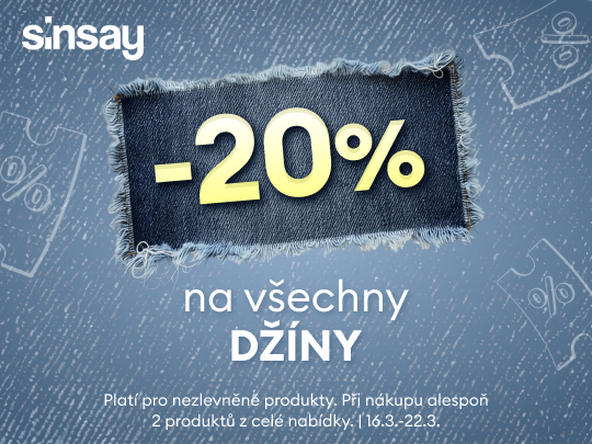 Od 16. do 22. března objevte stylové džíny se slevou 20 %! Oživte svůj šatník trendy kousky a doplňky a užijte si pohodlí i styl v jednom.