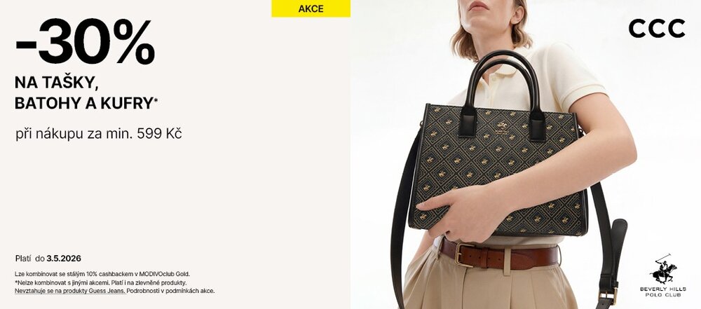 Vyberte si svůj nový kousek na cesty i do města se slevou 30 % při nákupu za min. 599 Kč. Stylové tašky, praktické batohy i prostorné kufry teď pořídíte ještě výhodněji. Akce platí i na zlevněné produkty do 3. 5. 2026 v prodejnách CCC, v aplikaci a ZDE.