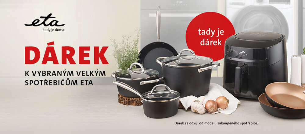 Vychází z vaší lednice občas podivné zvuky? Pračka ždíme, jen když se jí chce? Nebo vaše staré spotřebiče ještě slouží, ale vy byste si jednoduše přáli nové? Tohle je vaše znamení! Právě teď můžete k vybraným velkým spotřebičům získat skvělé dárky. Co byste řekli na novou sadu nádobí, horkovzdušnou fritézu nebo sadu pánví? Stačí si pořídit pračku, chladničku nebo jiný spotřebič zařazený do této akce, zaregistrovat nákup a jeden ze tří dárků v hodnotě až 2 499 Kč může být váš. Akce se vztahuje na vybrané velké spotřebiče zakoupené v období 24. 1. – 31. 3. 2026 nebo do vyprodání zásob dárků na e-shopu nebo ve značkových prodejnách ETA. Registrace je možná nejpozději do 12. 4. 2026. Kompletní pravidla akce najdete ZDE.