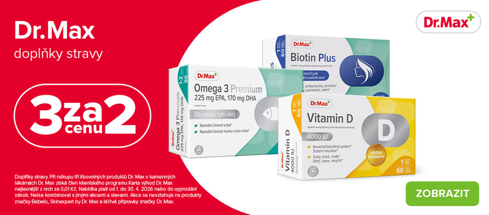 Při nákupu 3 libovolných produktů značky Dr. Max v kamenných lékárnách Dr. Max získá člen klientského programu Karta výhod Dr. Max nejlevnější z nich za 0,01 Kč.