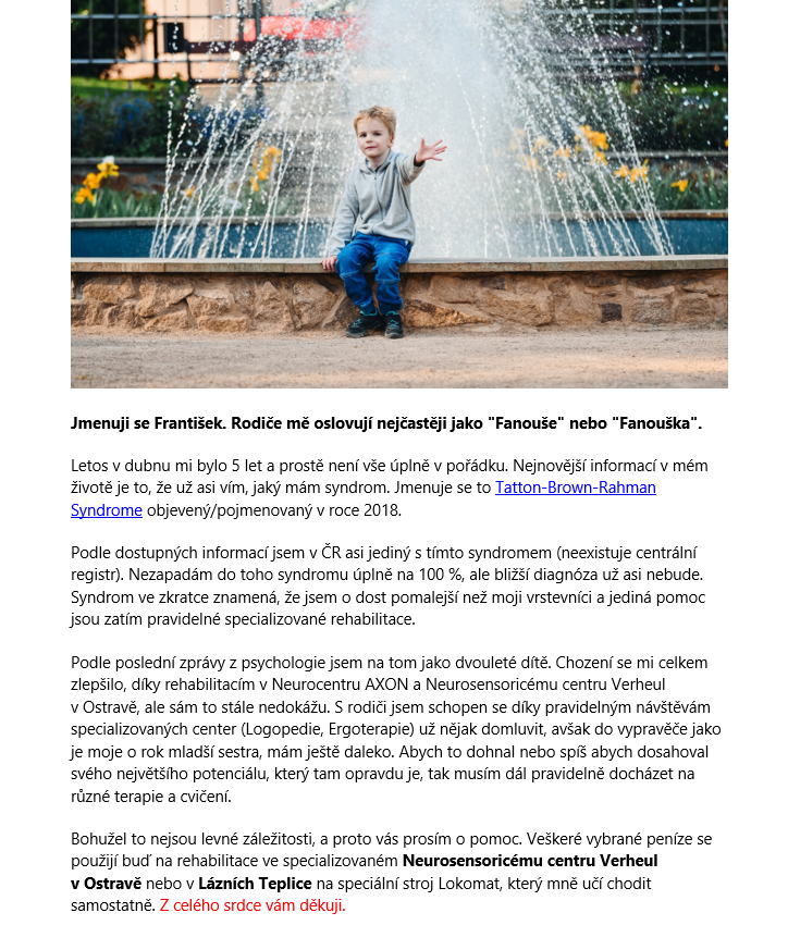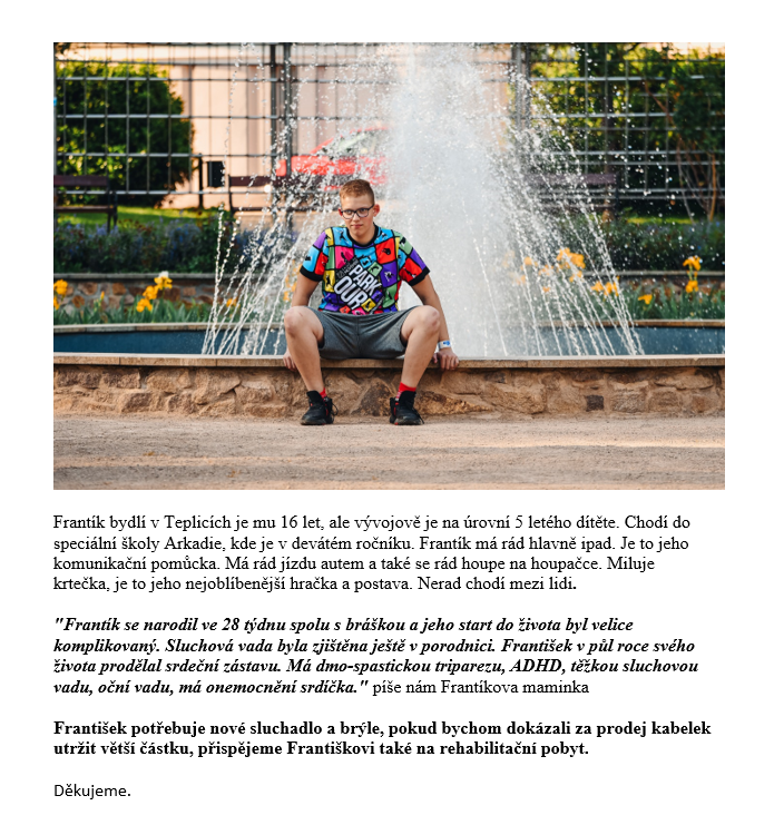 Příběhy obou dětí si prosím otevřete níže. Zboží budeme prodávat za symbolické ceny a 100% výtěžku bude rozděleno mezi tyto dva chlapce přes nadaci Život dětem.