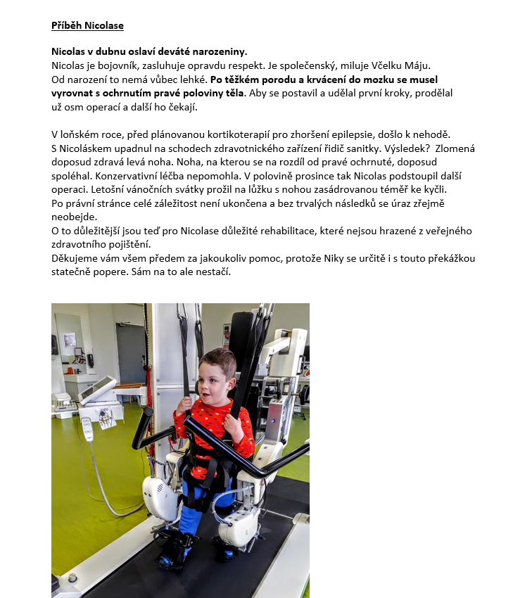 Rodina Nikolase a Marušky finanční příspěvek využije na rehabilitační pobyt a pomůcky. Toníčkovi pomůžeme zaplatit intenzivní logopedickou terapii.
