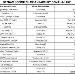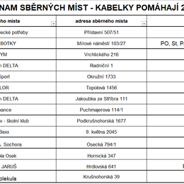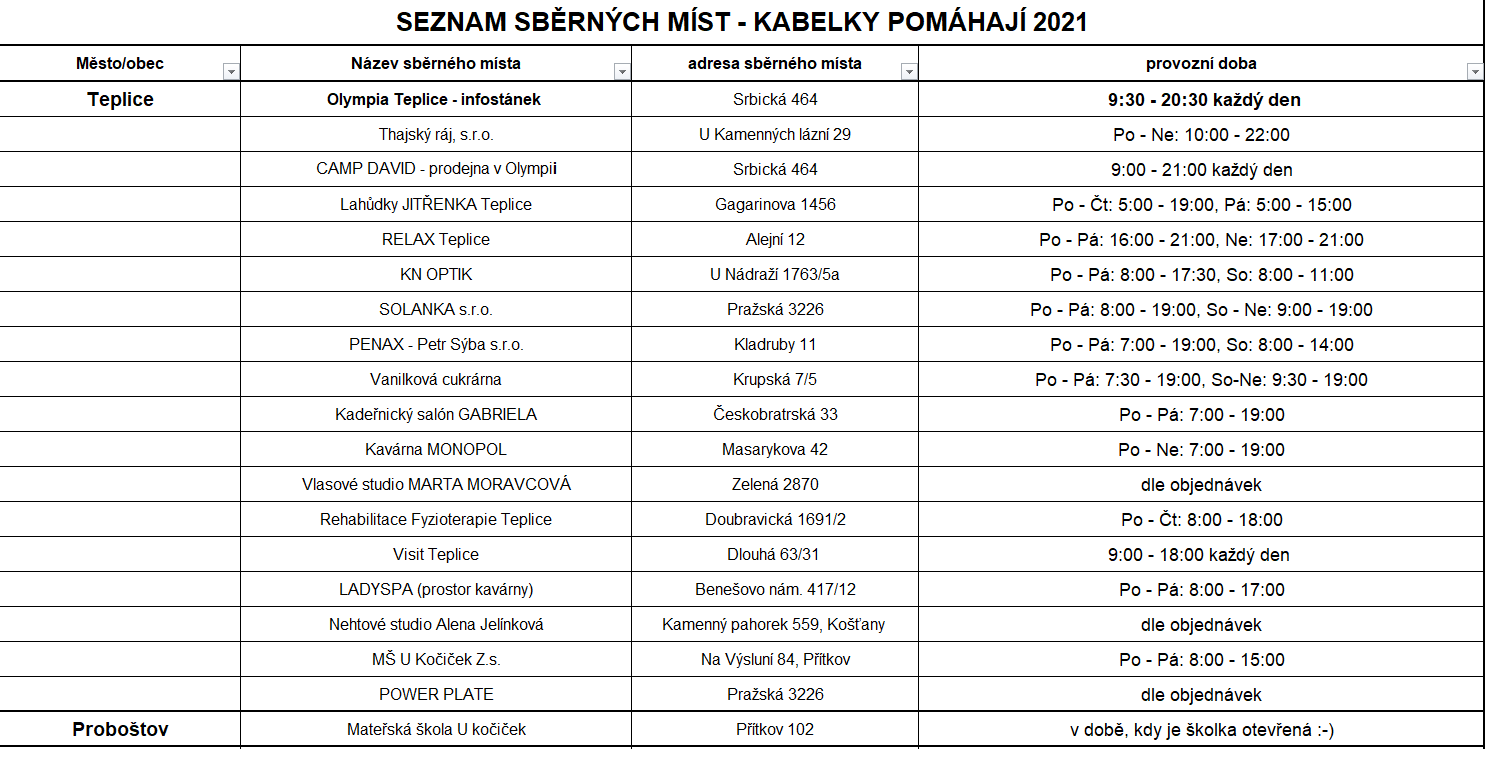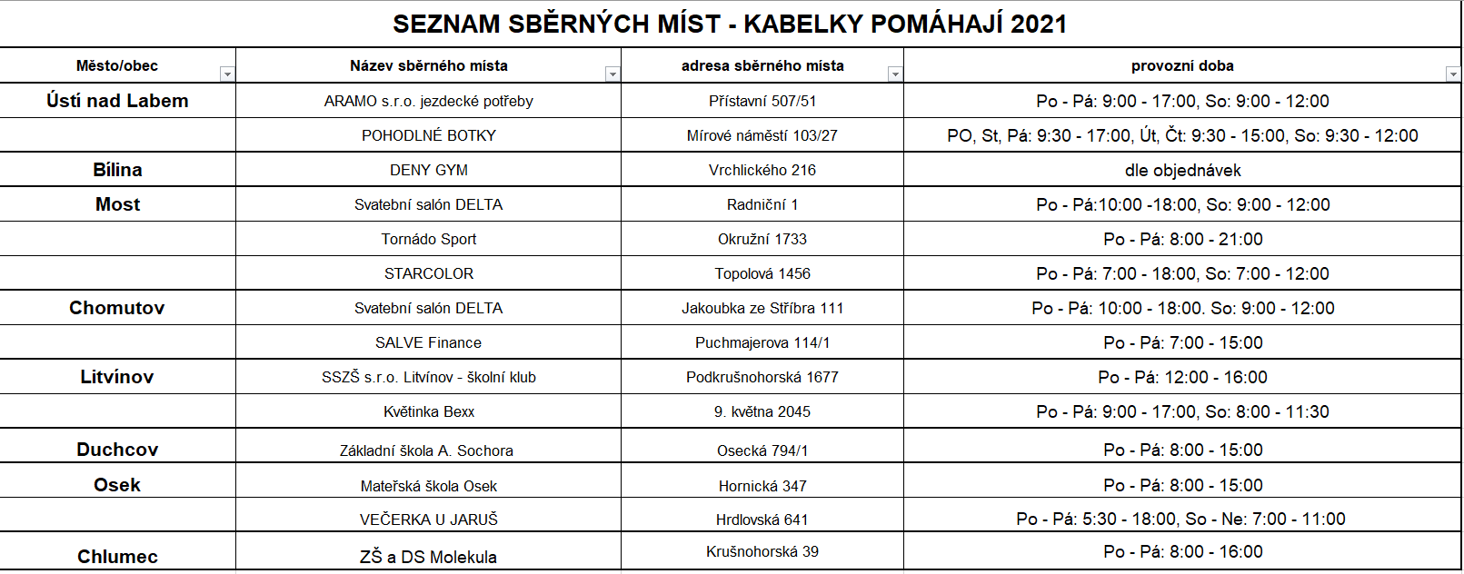 Přineste nám kabelku na infostánek. Infostánek je otevřený každý den v čase 9:30 - 20:30. Máte to k nám daleko? Nevadí. Níže najdete kompletní seznam sběrným míst po celém Ústeckém kraji. Kabelku můžete odnést na jakékoliv sběrné místo v seznamu, my se postaráme o to, aby se kabelky dostaly včas k nám. Děkujeme všem partnerům, kteří se stali pro tento projekt sběrným místem. Mnoho z nich už s námi spolupracuje úplně od začátku, velmi si této podpory vážíme.