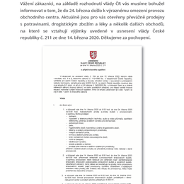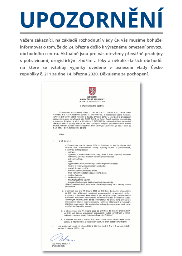na základě rozhodnutí vlády ČR vás informujeme, že s platností do 24. března 2020 dochází k omezení provozu obchodního centra.