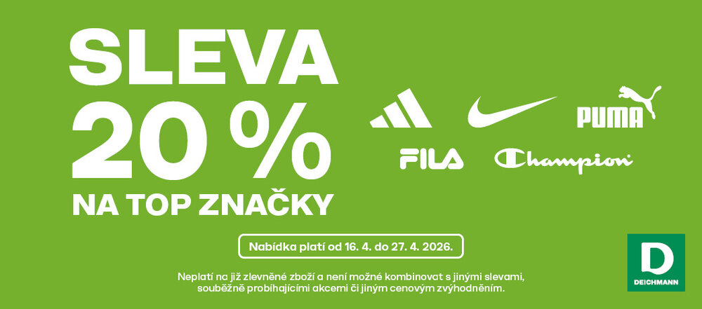 Dobrá zpráva pro všechny milovníky TOP značek! V prodejnách Deichmann na vás stále čekají oblíbené kousky se slevou 20 %. Ano, slyšíte správně — akce na značky Adidas, Nike, Puma, Fila a Champion byla prodloužena. Opakujeme: prodloužena!