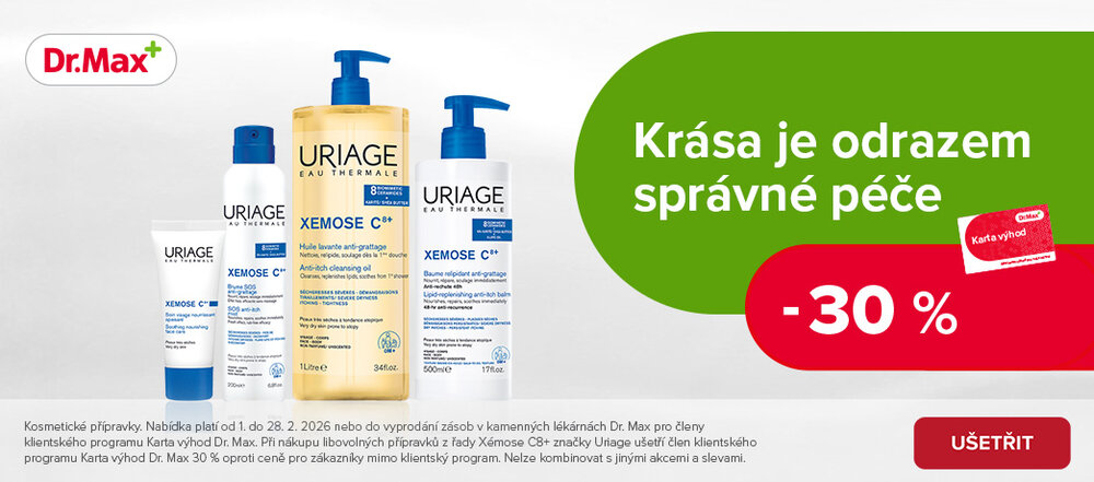 Při nákupu libovolných přípravků řady Uriage Xemose C8 ušetří člen klientského programu Karta výhod Dr. Max 30 % oproti ceně bez Karty výhod. Nelze kombinovat s jinými akcemi a slevami.