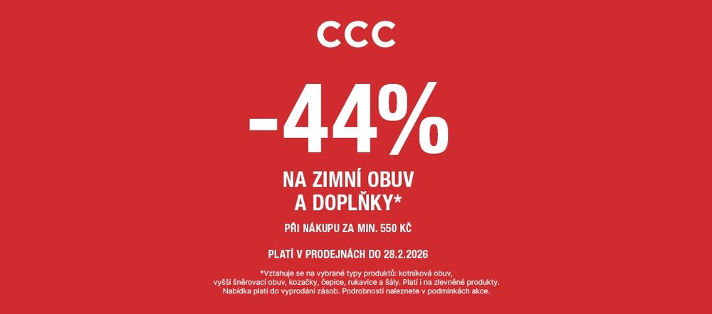 Sleva 44 % na zimní obuv a doplňky při nákupu za min. 550 Kč. Oživte svůj šatník stylovými kousky. Sleva se vztahuje i na zlevněné produkty! Akce platí do 28. února v prodejnách CCC!
